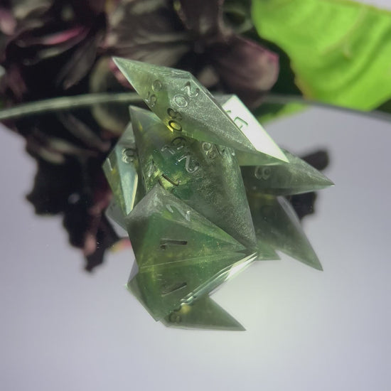 This Standard 7 Set Dice - Depleted Uranium set features a dark silver coloring with neon green streaks running through the inside. Painted with bright silver numbers. The fluorescent colors make it glow like depleting uranium! Handmade with impeccable attention to detail, this set is sure to elevate any RPG game. Includes all the dice necessary for most standard tabletop games!