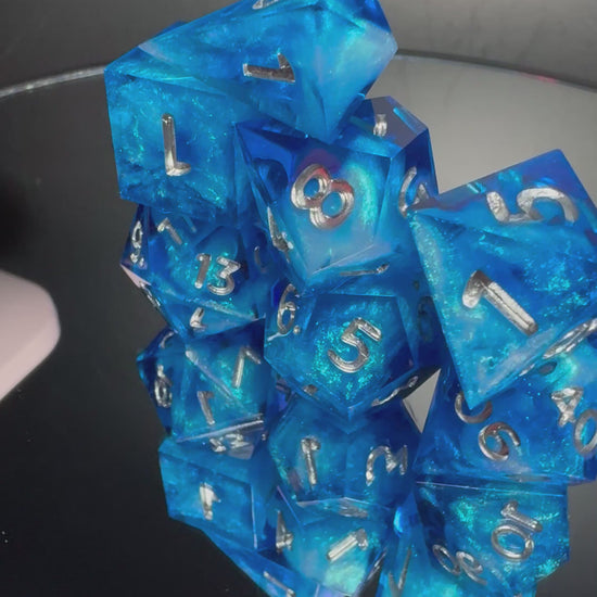 This Standard 7 Piece Set Dice - Fathomless features a vibrant blue with swirls of multicolor. The numbers are painted chrome. Handmade with impeccable attention to detail, this set is sure to elevate any RPG game. Includes all the dice necessary for most standard tabletop games!