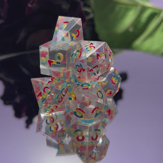 This Standard 7 Set Dice - Pride set features crystal clear dice with a touch of glitter. The numbers are painted all of the colors of the Pansexual flag. Handmade with impeccable attention to detail, this set is sure to elevate any RPG game. Includes all the dice necessary for most standard tabletop games!