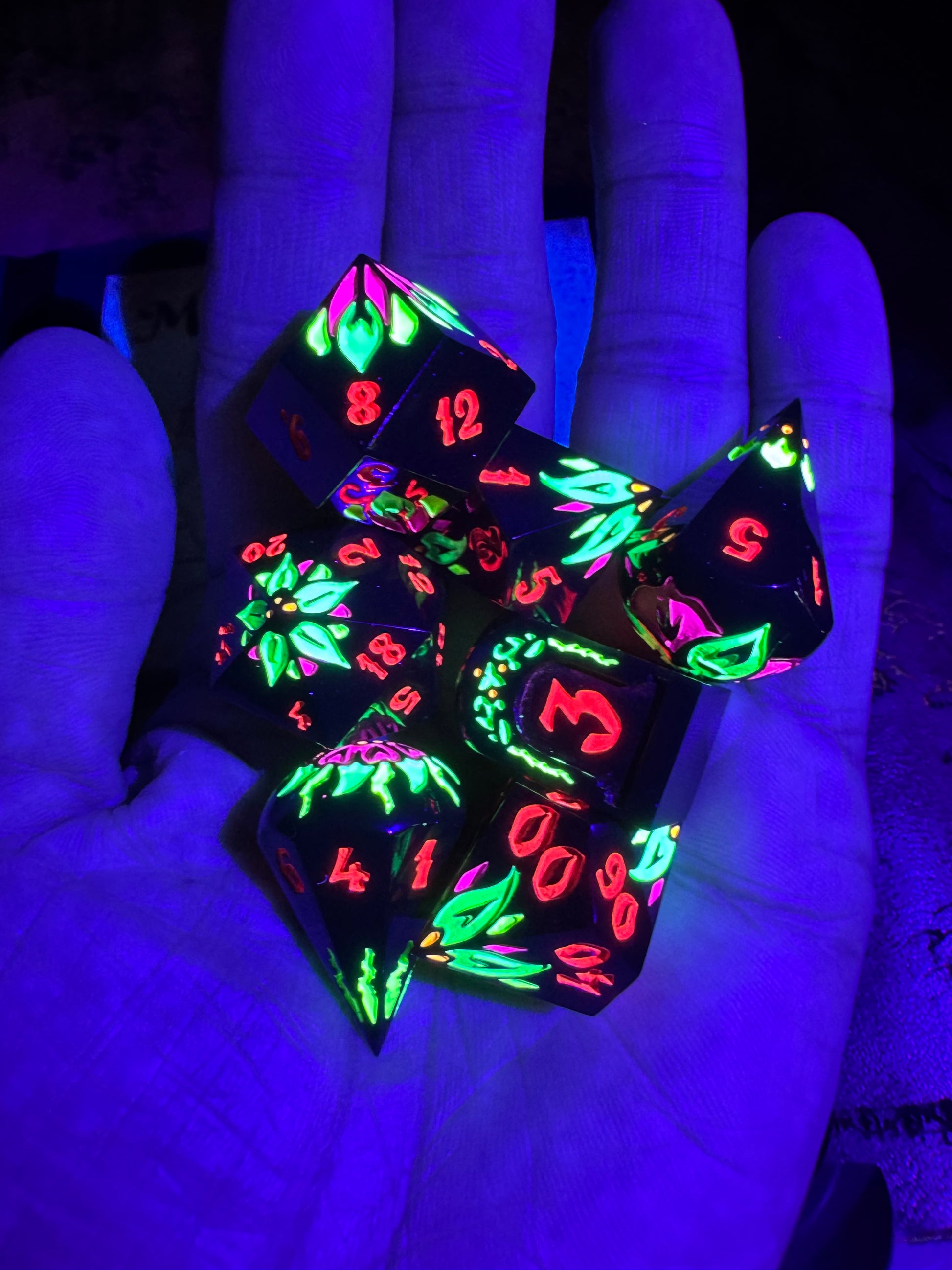 This Standard 7 Piece Set Dice - Retro features a black base with neon paint! The design of the dice include toxic flowers and a tombstone shaped D4. Handmade with impeccable attention to detail, this set is sure to elevate any RPG game. Includes all the dice necessary for most standard tabletop games!